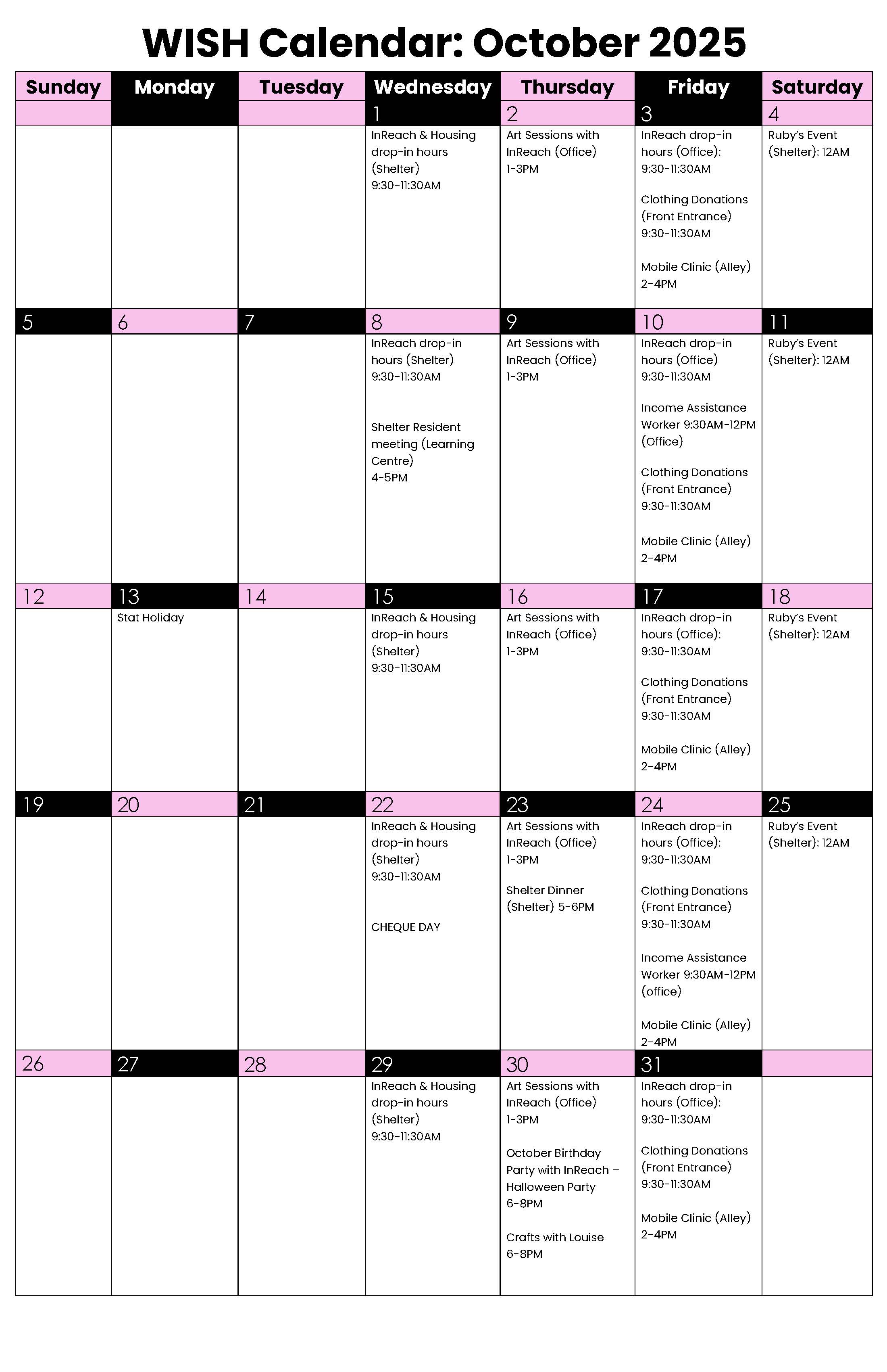 The monthly WISH Calendar lists activities, opportunities, and services available for WISH participants. Our space is open to cis and trans women, Two-Spirit, non-binary, and gender diverse sex workers.