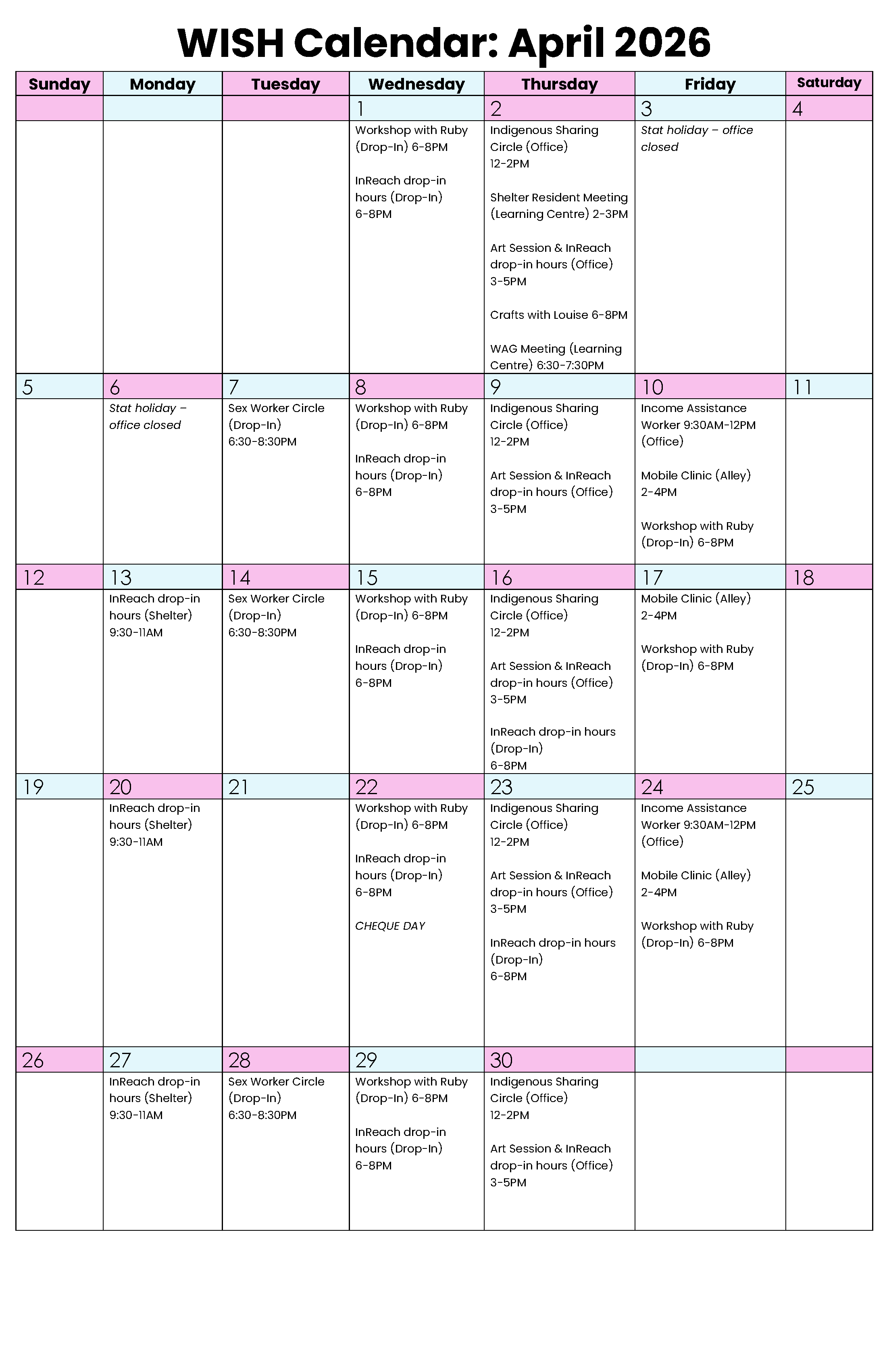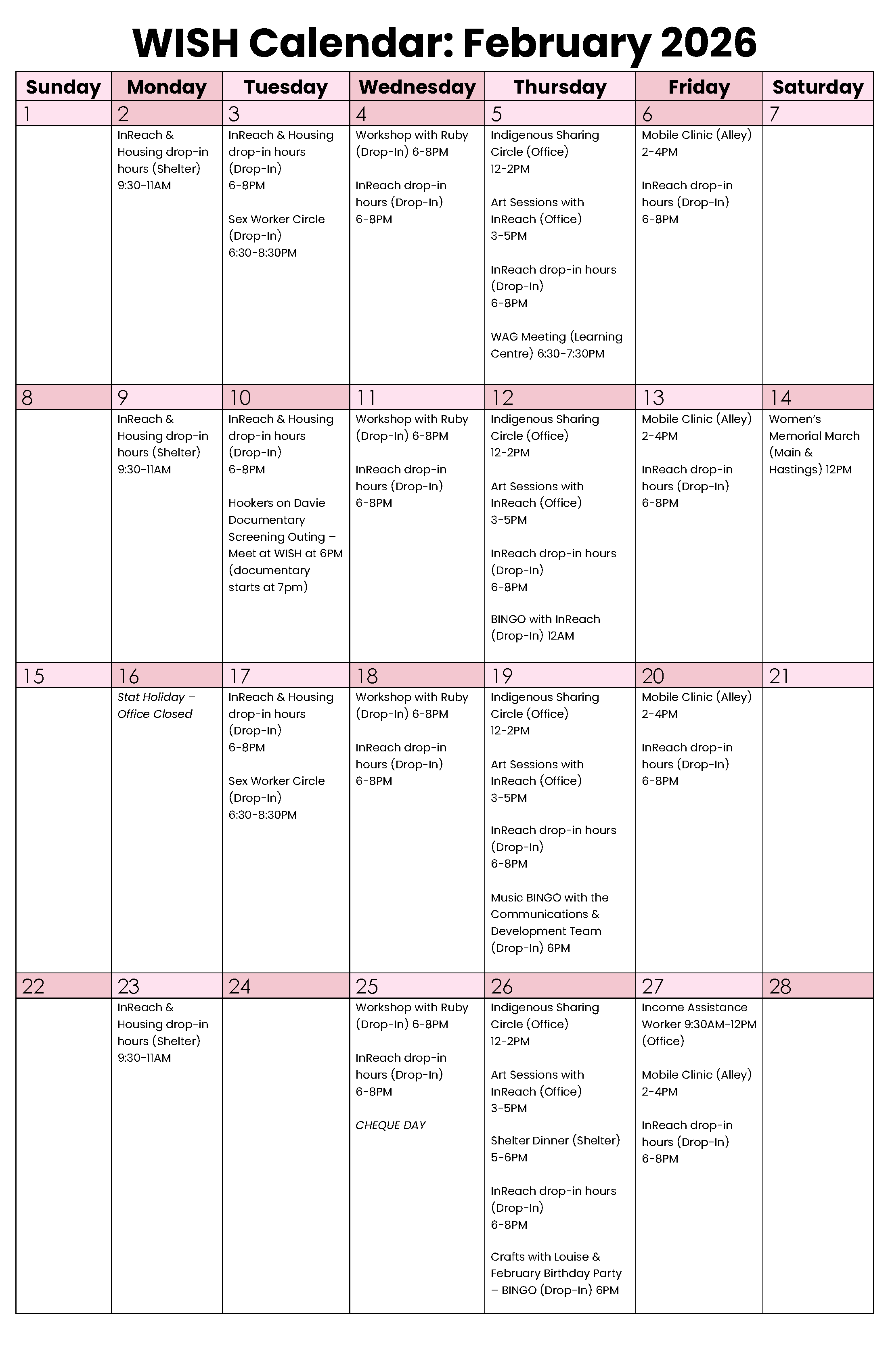 The monthly WISH Calendar lists activities, opportunities, and services available for WISH participants. Our space is open to cis and trans women, Two-Spirit, non-binary, and gender diverse sex workers.